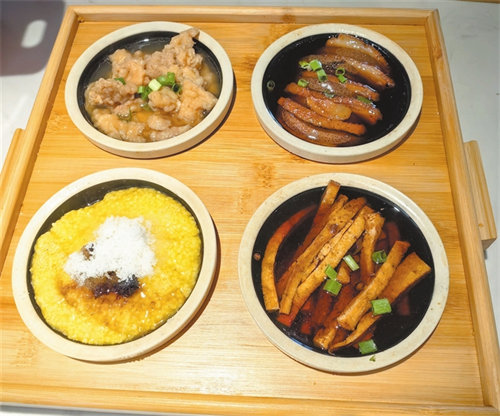 目前店里有20多種蒸菜,主要包含河東四小碗、豬肉大蔥蒸菜、茼蒿蒸菜、油麥菜蒸菜、一面情深、清蒸排骨、清蒸雞塊等,每個都極具特色。比如,河東四小碗是指扣肉、酥肉、餾米、豆腐條,其中,扣肉中間夾著梨片,比較解膩,口感極好;酥肉外面裹一層面,需先炸后蒸;餾米融合了優(yōu)良紅棗,具有營養(yǎng)價值;豆腐條需切片后去炸,再切成條狀。一面情深是由胡蘿卜絲和面蒸成。