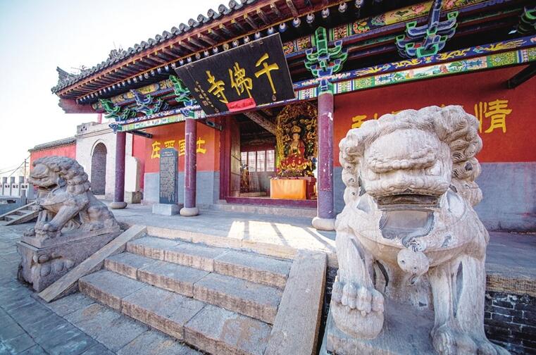 現(xiàn)千佛寺坐南朝北,一進(jìn)院落布局,南北48.6米,東西33.42米,占地面積1624.21平方米。中軸線有天王殿、大雄寶殿,兩側(cè)為鐘樓、鼓樓、耳殿、配殿。