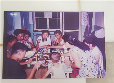 1988年中秋,王艷(正對鏡頭女生)與家人吃團圓飯。