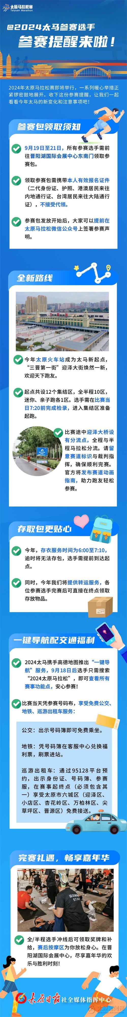 2024年太原馬拉松賽即將舉行,一系列暖心舉措正緊鑼密鼓地展開。收下這份參賽提醒,讓我們一起看看今年太馬的新變化和注意事項(xiàng)吧!