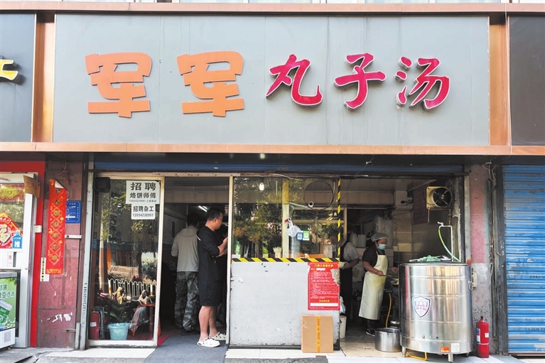 “軍軍,兩小碗,加雞蛋,半斤烙餅!”“老板,老樣子,大碗加粉條、加海帶,不放香菜!”清晨6時許,漂滿丸子的大鍋內湯水翻滾、熱氣升騰,迎面撲來的香氣頓時讓人垂涎欲滴。此時,店里的食客已經是絡繹不絕,有打包帶走的,有在此就餐的。帶走的滿心歡喜,就餐的吃得津津有味、大汗淋漓。來晚的顧客在店內找不到桌子,就會拿著小板凳坐在店門前路邊吃。“丸子湯要趁早喝,‘第一口’湯乳白醇香,丸子韌而有勁,味道最好。”一位顧客說。