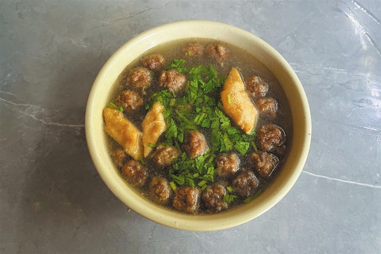 清晨,耳邊響起的,和舌尖最先觸碰到的,就是一座城市的味道。13年歷史的小店,積累了不少人氣。從大鍋里盛碗丸子湯,20個丸子,配3片油豆腐,香菜、蔥花點綴其間,丸子筋道、湯汁鮮美、烙餅溫熱、咸菜脆爽,讓一個早晨不再尋常。有時,烙餅泡在丸子湯里,也是一道吃法。“老板,再給續點湯。”食客一句喊,其實是表揚。