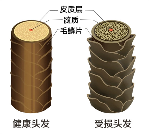 頭發(fā)受損時(shí),首當(dāng)其沖的是覆蓋在表面的毛鱗片,可能會(huì)因損傷而翹起、呈鋸齒狀或脫落,使得頭發(fā)內(nèi)部的皮質(zhì)層暴露在外,加重水分流失等情況,造成干枯、毛躁等一系列問(wèn)題。