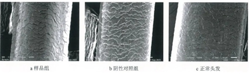 護(hù)發(fā)精油處理過(guò)的樣品組毛鱗片只有輕微脫落,整體較平整,可以防護(hù)一定高溫?fù)p傷。