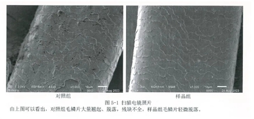 從照片可以看出,相比對(duì)照組的受損頭發(fā),樣品組的頭發(fā)經(jīng)過(guò)護(hù)發(fā)精油處理后毛鱗片更平整、貼合發(fā)絲。