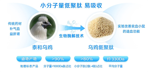 完美精選來自地理標志性產品的“泰和烏雞”,應用酶解技術制得小分子量烏雞低聚肽,其中2肽-4肽占比80%+。
