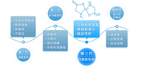 甘氨酸亞鐵作為第三代鐵,具有生物利用率高、胃腸刺激小、穩定性好的優勢[8]。
