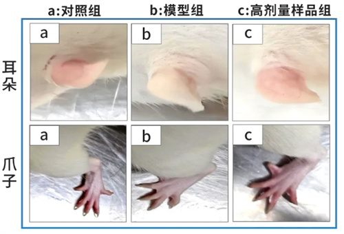 相比模型組,樣品組大鼠耳朵、爪子顏色紅潤有光澤,且效果隨劑量增加而提升。