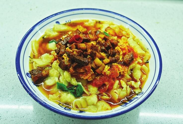 “老板,來兩碗擦圪蚪?!庇惺晨忘c餐。擦圪蚪是平遙特色面食,不同于其他純手工面食,它有專用工具,叫礤子。在兩根約40厘米長的方型木棍中間,釘一片金屬片,金屬片呈拱形,一般是銅片,或者不銹鋼的,金屬片上整齊地鑿開許多小窟窿,呈扁圓形,以便讓面通過。再把翹起的鱗狀部分開刃,易于切割面團。這種工具只在平遙當(dāng)?shù)厥褂茫渌胤胶苌僖姟?/p>