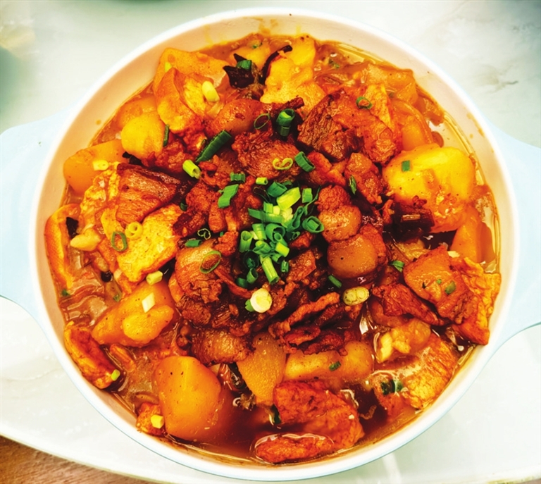 炒菜見功夫。紅辣椒炒羊雜、炒肥腸,鄉(xiāng)土氣息伴著麻辣鮮香,撲面而來;油炸的水庫小河蝦,燉煮的水庫大鯉魚,肉炒的云頂山蘑菇,把地域標(biāo)志變得活色生香;土豆面生熟兩種做法又合炒的炒兩樣,有著豆腐、燒肉、海帶、蘑菇的燴盤子,盛滿軟面土豆塊的小炒肉炒土豆,讓你充分體會食材的多變性和命名的隨意性。