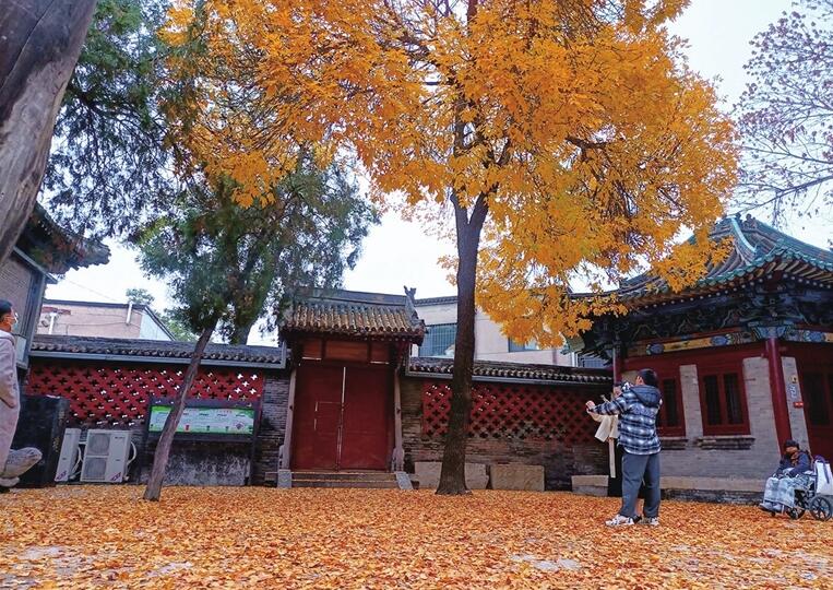 在太原文廟,一棵白蠟樹下,落滿了黃葉,不少市民來此拍照。有人特意穿上漢服,在樹下留影。還有人踩著白蠟樹落葉,彎腰抓兩把,揚(yáng)起來,讓葉片頑皮地落在頭上、肩上、手上。站在一旁的同伴,立刻按下快門,定格美好瞬間。