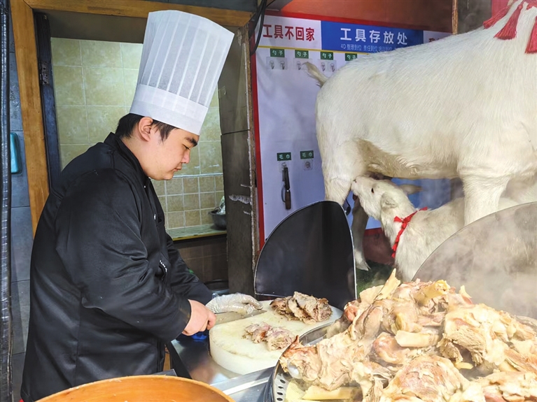 此菜為何出類拔萃?店長蔚紅娥解釋食材珍貴乃首因。這道菜用的是來自于中陽縣的絨山羊,以柏籽、柏葉為食,人稱“柏籽羊”。其肉油分明,肥嫩細(xì)膩,肉質(zhì)呈紫紅色,油色潔白如玉,食之有一種柏樹的馨香,風(fēng)味獨(dú)特,回味無窮。其次,制作手法也很獨(dú)特,將羊肉放進(jìn)涼水中煮沸,然后把血沫子撇干凈,接著放入獨(dú)家秘制小調(diào)料用大火燒開,再改用小火將羊肉燉至軟爛。隨后,將羊肉按紋理切成肉片,放入小籠屜與帶藥湯的砂鍋、蘸料、菜碟一起端上飯桌,羊肉的鮮香頓時涌入鼻腔,讓人欲罷不能。