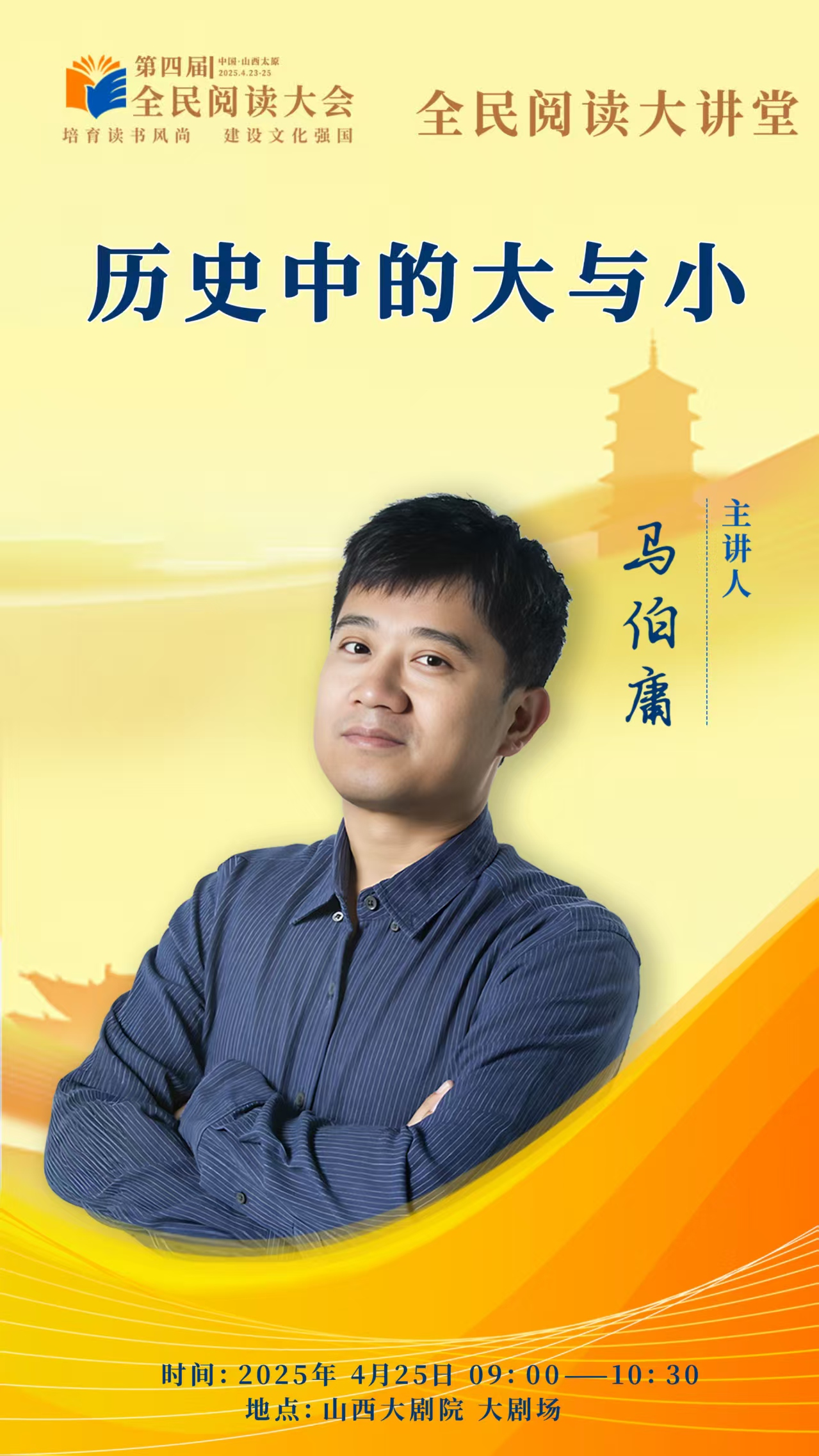 4月23日,主題為“培育讀書風尚建設文化強國”的第四屆全民閱讀大會將在山西太原舉辦。為深化全民閱讀活動,在全社會進一步營造愛讀書、讀好書、善讀書的濃厚氛圍,吸引更多人關注閱讀、參與閱讀,為讀者搭建與名家“面對面”的平臺,作為第四屆全民閱讀大會的重要活動之一,“全民閱讀大講堂”將于4月24日、25日兩天在山西太原山西大劇院大劇場開講。