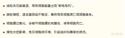 細胞,這個構(gòu)成人體的最小生命單位,就像精密運轉(zhuǎn)的微型工廠:線粒體是24小時發(fā)電的能量站,端粒是記錄壽命的“計時沙漏”,細胞膜是抵御外界侵襲的防火墻。然而,隨著自由基的瘋狂攻擊、代謝廢物的堆積、DNA損傷的累積,細胞逐漸“罷工”,逐漸走向衰老,擴展到組織、器官乃至整個機體[1]。