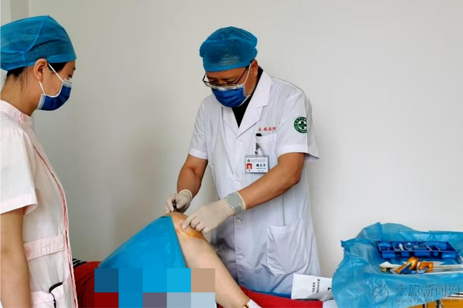 醫生先對患者進行腰椎側隱窩神經阻滯鎮痛治療,隨后將線埋入經絡穴位處,通過持久刺激,來緩解腰腿肌肉疼痛。
