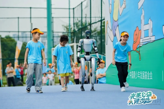 在充滿童趣的歡快氛圍中,主持人靚靚攜手宇樹機器人“小蝦米”開啟活動序幕。伴隨著動感節拍,“小蝦米”以靈動揮手、俏皮走動的萌態閃亮登場,引得現場觀眾陣陣歡呼。當主持人邀請臺下小朋友即興互動時,“小蝦米”通過精準的動作響應與孩子們默契配合,科技感十足的舞蹈與天真童趣碰撞出獨特火花。這場由智慧科技與純真童心共同演繹的開場秀,不僅以科技創新展示的形式提升了體育運動趣味,更把健康快樂傳遞給每位參與者。