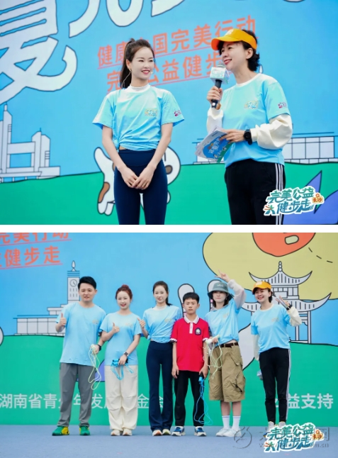 活動現場,奧運冠軍楊家玉與健行者們展開妙趣橫生的健康互動。伴隨主持人靚靚的熱情號召,來自湘鄉毛田鎮希望小學的學生代表、家庭參與者、健身達人組成“健康天團”,與奧運競走冠軍展開跳繩耐力賽。彩繩翻飛間,楊家玉親身示范標準動作,帶領健行者跳出新花樣。隨后的平板支撐挑戰環節,三位完美創業伙伴代表勇敢登上舞臺,在奧運冠軍的激勵下突破自我極限,汗水與歡笑交織的運動畫面引發陣陣喝彩。楊家玉全程以專業指導陪伴互動,將競技體育精神轉化為全民共享的健康密碼,生動詮釋了"運動沒有門檻,每個人都是生活冠軍"的理念。