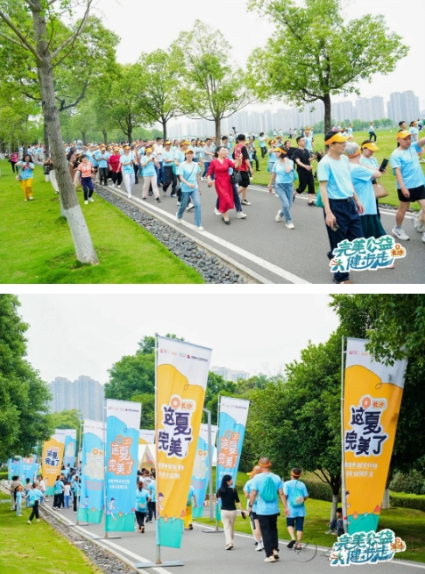 健步走過程中,參與者們相互鼓勵、并肩前行,充分展現出團隊協作的精神。他們穿梭在洋湖濕地公園的花海田園和繽紛的林蔭小道之間,感受著夏日的氣息和長沙的熱辣滾燙。歡笑聲、交談聲在綠意中回蕩,與鳥鳴聲、風聲營造出獨特的夏日樂章,構成了一道亮麗的風景線。