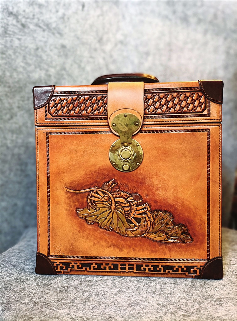 皮雕藝術作為我國傳統工藝瑰寶,起源于距今4000多年的青銅時代。新疆五堡墓葬出土的軋渦旋紋革盒,上面刻有精美的渦旋紋,是距今發現最早的傳統皮雕雛形。春秋《考工記》中記錄了“攻皮之工:函人為甲”,先秦時的皮甲已繪有圖案花紋。遼代時盛行“革囊盛乳”的皮囊壺,表面已有皮雕裝飾。山西皮雕盛行于清末民初,大同最早,有皮箱、皮包、書箱、帽盒、脈枕、皮枕等。