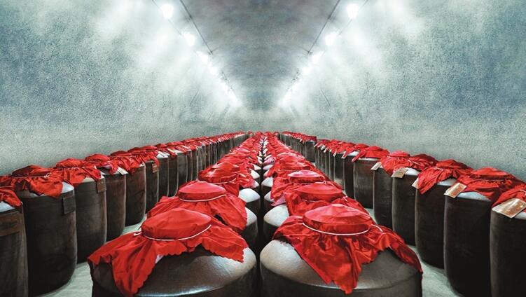 發酵好的酒醅取出陶缸,加入輔料后蒸餾,這一過程中,原漿酒由冷卻器中流出。釀酒師依照酒花大小程度來判別酒頭、原酒和酒尾分別量質摘酒。蒸餾出的“大茬”“二茬”原酒分別置入陶壇等容器中密封貯存。“大茬”“二茬”原酒各具特色,存放時間最少3年以上。晉酒釀造獨特的“雙重陳釀”工藝,是將原漿酒經一次陳釀后再進行加漿降度,精心勾調,達到一定品質目標的成型酒后,再次進入陶缸等容器陳釀。
