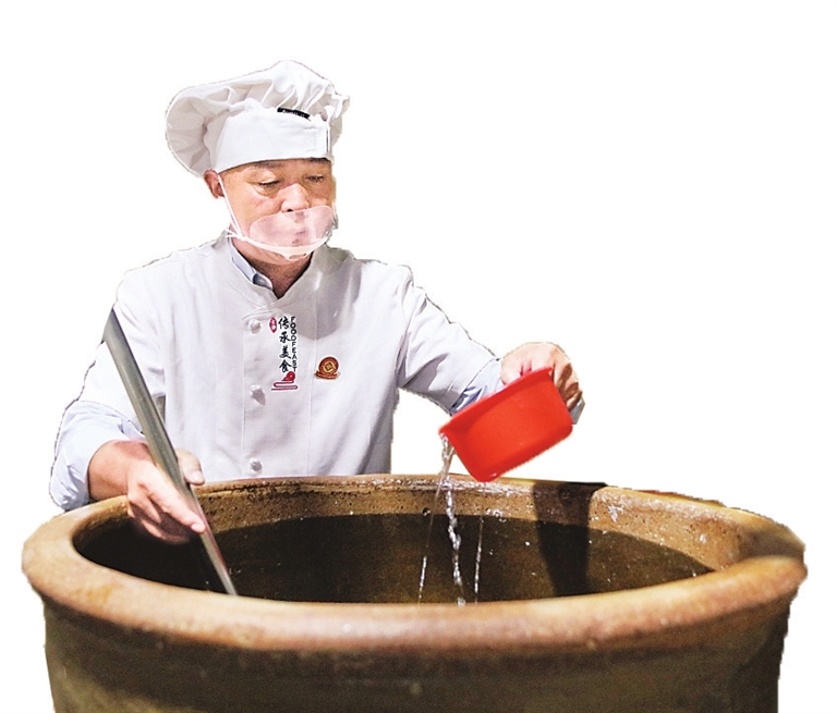 “這個(gè)力道要恰到好處,”潘志強(qiáng)一邊調(diào)整石塊的位置,一邊對徒弟說,“太重了壓得太實(shí),太輕不易成型?!痹谒那墒窒?,杠桿緩緩下沉,豆腐腦中的水分被均勻地?cái)D壓出來,逐漸凝固成型。這套古老的木壓裝置雖然占地方、費(fèi)力氣,但壓出的豆腐外韌內(nèi)軟,口感獨(dú)特,豆香也更濃郁。