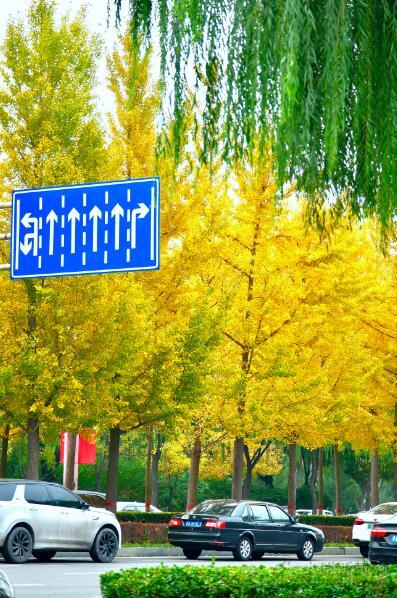 從濱河西路轉入長風西街,猝不及防的金色浪潮奔涌而至——中央綠化帶的銀杏高舉燦燦華冠,陽光為葉鍍上琥珀光暈。秋風拂過,“金蝶”翩躚落于常青灌木,躍動著生命與季節的二重奏。