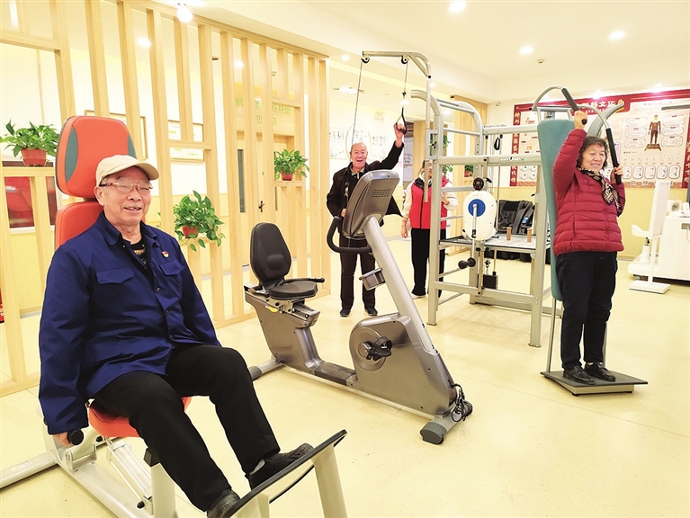 老年人在玉園南社區(qū)居家養(yǎng)老服務(wù)中心內(nèi),使用專屬健身器材鍛煉