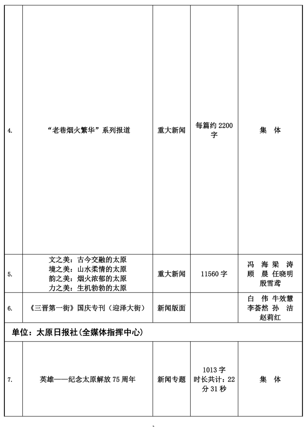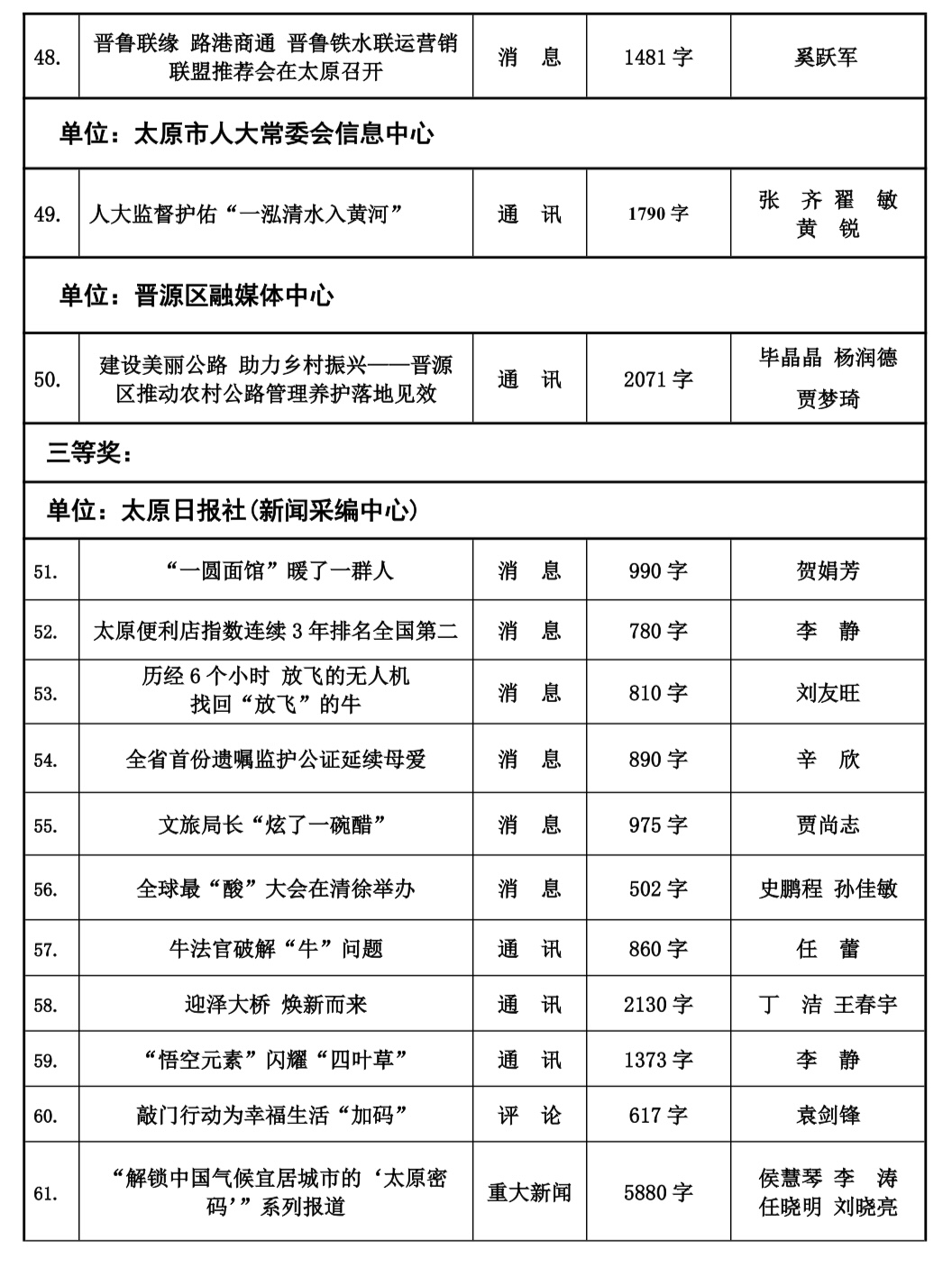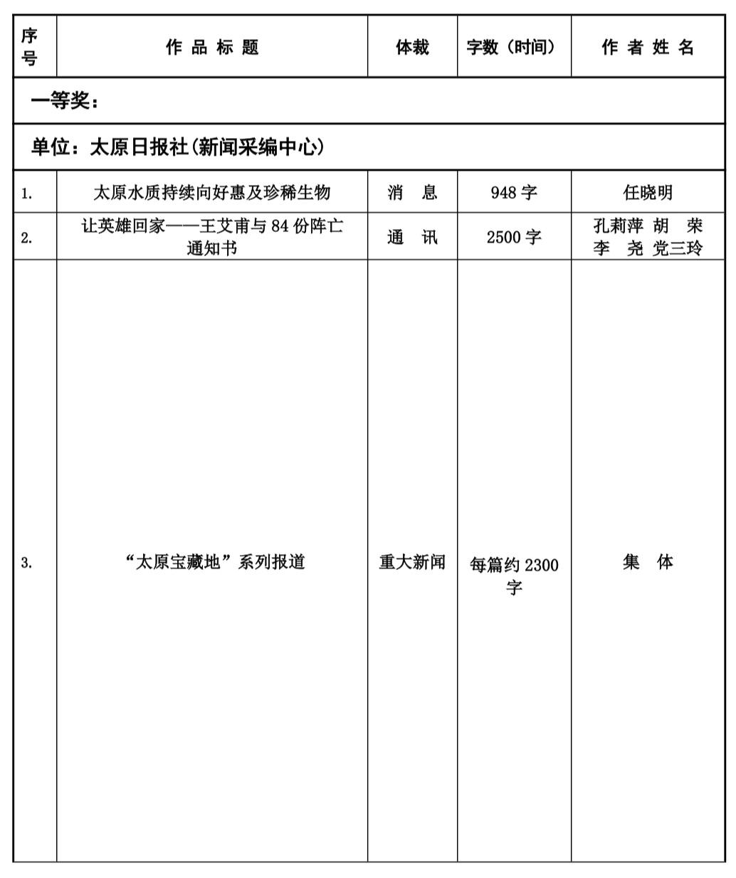 本屆太原新聞獎評選工作自今年2月份正式下發評獎文件以來,全市各會員單位認真組織評選,經單位推薦以及自我推薦,于四月中旬陸續收到各會員單位報送參評作品總計125件。市記協嚴格按照程序,共評選出100件入圍作品,并于10月20日,組織專家評委對100件入圍作品最終定評,產生一等獎20件,二等獎30件,三等獎50件,現予公示。公示時間為五個工作日,如有問題,可來電、來函反映。太原市新聞工作者協會地址:新建路78號新聞大廈4層,聯系人:喬亞軍,電話:15235375197。