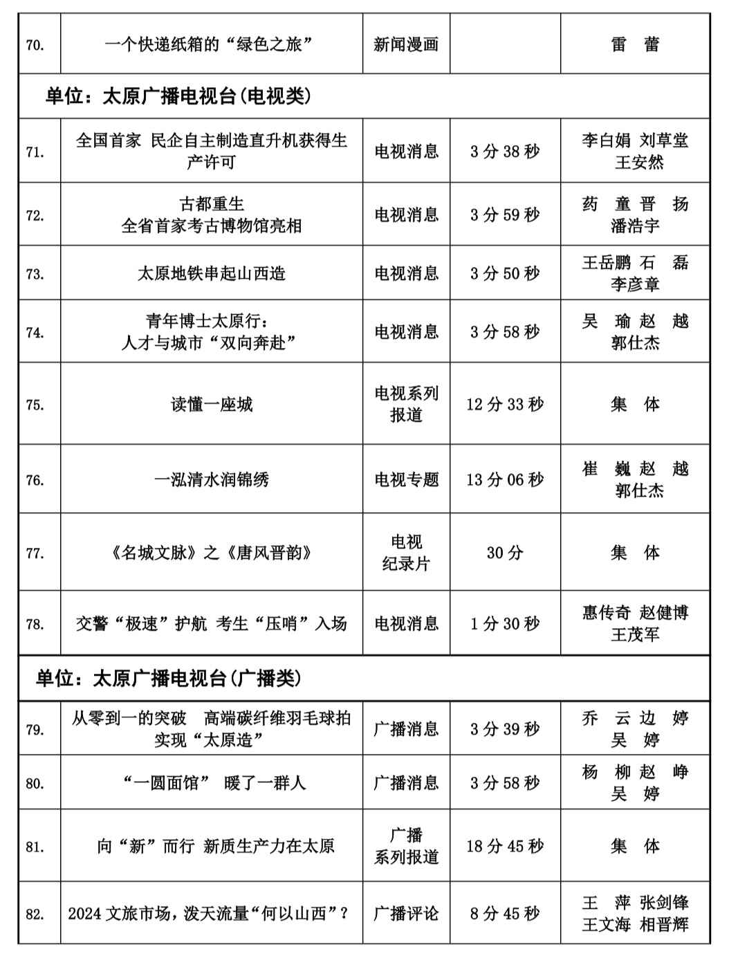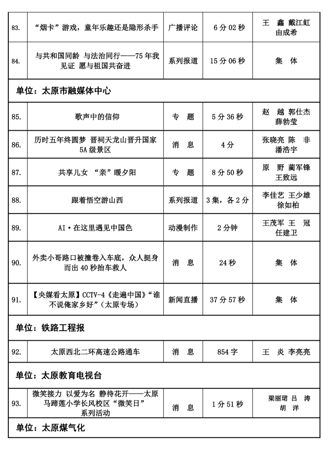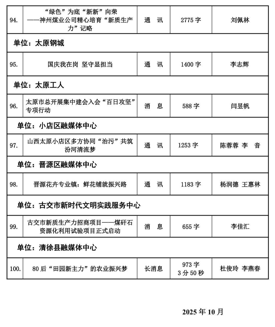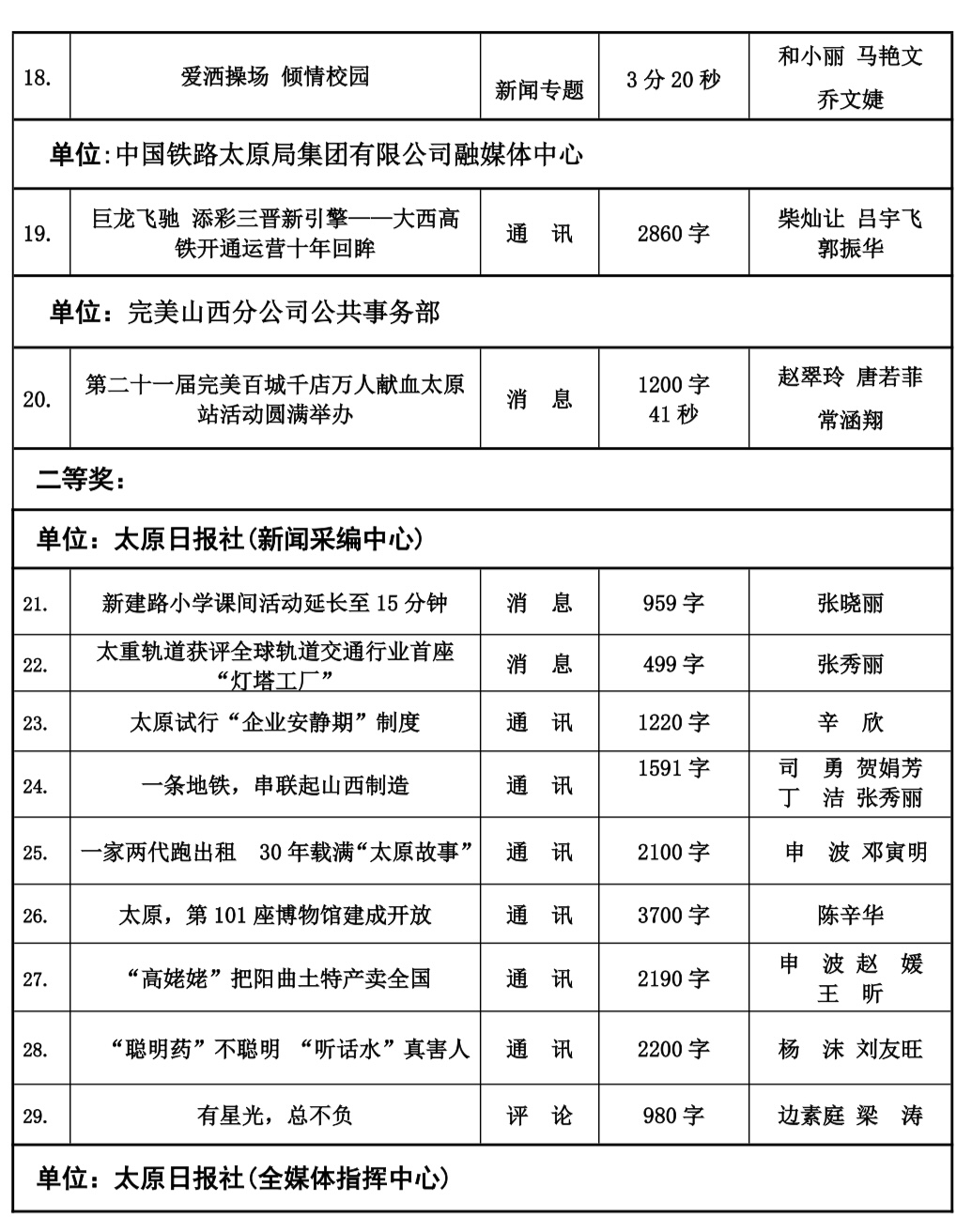 本屆太原新聞獎評選工作自今年2月份正式下發評獎文件以來,全市各會員單位認真組織評選,經單位推薦以及自我推薦,于四月中旬陸續收到各會員單位報送參評作品總計125件。市記協嚴格按照程序,共評選出100件入圍作品,并于10月20日,組織專家評委對100件入圍作品最終定評,產生一等獎20件,二等獎30件,三等獎50件,現予公示。公示時間為五個工作日,如有問題,可來電、來函反映。太原市新聞工作者協會地址:新建路78號新聞大廈4層,聯系人:喬亞軍,電話:15235375197。