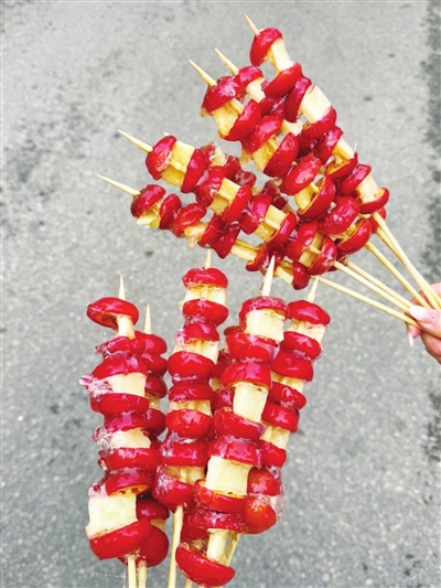 入冬后,冰糖葫蘆成了最具風味的時令小吃。近兩年,社交平臺上出現很多“網紅款”冰糖葫蘆,比如去年流行的“1米大串”,長度為1米的竹簽上,串著橘子、草莓、山楂、楊桃、葡萄等水果,吸引了不少年輕人嘗鮮。今年,奶皮子糖葫蘆突然走紅,奶皮子是將鮮牛奶加熱至沸騰后冷卻形成,與普通糖葫蘆“二合一”后,被很多年輕人追捧。