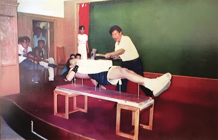 上世紀80年代,電視臺常有胸口碎大石、掌劈磚瓦、槍刺喉頭等硬氣功表演,部隊訓練也不乏類似科目。渾元一氣功,表現形式與此相類,器械抽打、拍打、擊打,力度和程度更讓人瞠目結舌。