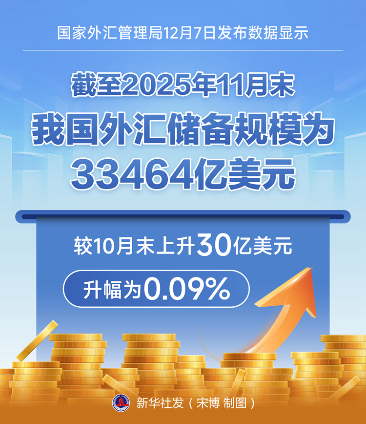 ?國家外匯管理局12月7日發布數據顯示,截至2025年11月末,我國外匯儲備規模為33464億美元,較10月末上升30億美元,升幅為0.09%。