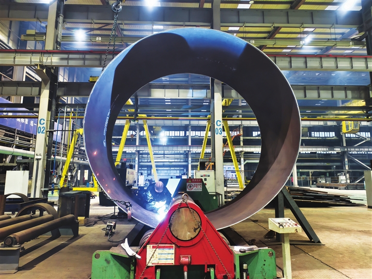12月9日,山西轉型綜改示范區山西鋼構科工有限公司鋼結構智能制造車間內,工人們爭分奪秒趕制訂單,努力實現全年生產目標,保障重點項目。圖為工作人員在進行卷圓作業。