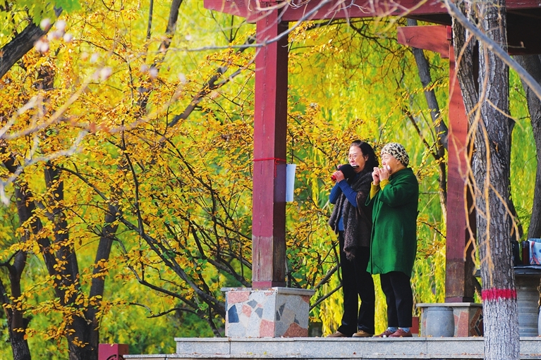 12月1日,游人在學府公園吹著口琴,享受冬日的暖陽,感受生活的美好。