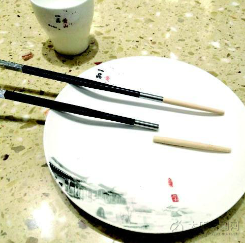 約定的飯店是位于瓦窯街上的一家特色菜館,閆女士一上樓,在吧臺處的醒目位置就看到懸掛著“提倡使用公筷公勺”的宣傳提示牌,頓時心里感覺挺踏實。“這個理念好,為健康把關。”落座后,桌上擺放的筷子更讓她眼前一亮。只見每位食客面前均有一雙“另類公筷”,乍一看與普通筷子無異,可細瞅,這種筷子分三段,最上面一段為黑色主體,中間是一小段金屬材質(zhì)的套子,能起到上下銜接作用,而最下端為一段長約三四厘米的木質(zhì)筷頭,可插入中間那段。再往桌上的轉(zhuǎn)盤一看,上面還有三雙公筷擺著,這下,閆女士就更踏實了。