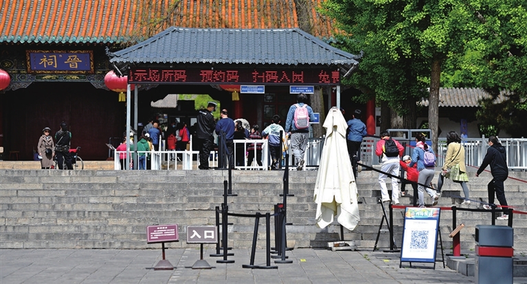 4月30日,游客通過預約掃碼進入晉祠景區游玩參觀。假日期間,有關部門提示,出游市民應遵守防疫要求,理性、錯峰、平安、綠色、文明出游。