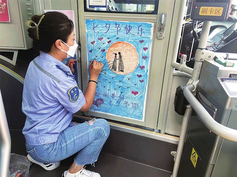公交駕駛員李靈正在手繪七夕海報。