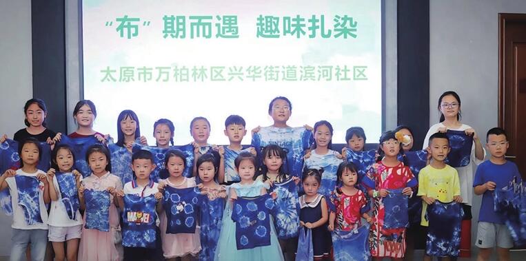 活動中,“小老師”劉璐瑗講解了扎染的歷史、技藝。在互動環節,她向大家演示了扎染的過程,并讓現場的小朋友們親身體驗了一把,感受扎染的神奇之處。在她的指導下,孩子們將白布先按喜好扎疊,再用皮筋扎緊,并將白布浸潤染液,之后水煮一段時間,拿出晾涼后打開,每一塊布上就會呈現出各種各樣的圖案。濱河社區工作人員介紹,今后,還將繼續組織這樣寓教于樂的實踐活動,豐富社區孩子們的假期生活。圖為孩子們在展示扎染作品。