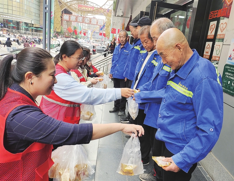 過節不離崗,一直奔波在路上是外賣小哥、快遞小哥、環衛工人等戶外工作群體的真實寫照。9月25日,寧化府社區工作人員和志愿者走上街頭,將親手制作的冰皮月餅送給他們,讓他們在緊張繁忙的工作中感受到城市的溫暖,獲得更多認同感和歸屬感?!案兄x社區對我們的關心,讓我感受到節日的氛圍,月餅甜心更甜?!笨爝f小哥吃著香甜的月餅,臉上滿是開心的笑容。