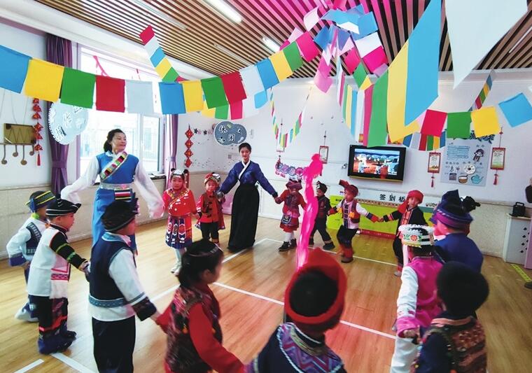 56個民族56朵花,56個兄弟姐妹是一家……1月2日上午,真武南路社區聯合轄區幾所幼兒園,開展“民族團結大聯歡”活動。各班級孩子們穿起民族服飾,在妙趣橫生的游戲中,一起體驗鄂倫春族的狂歡、苗族的蠟染、壯族的拋繡球、佤族的陀螺大戰,體驗民族特色服飾和節日活動的文化魅力。韓睿 梁慧云 攝