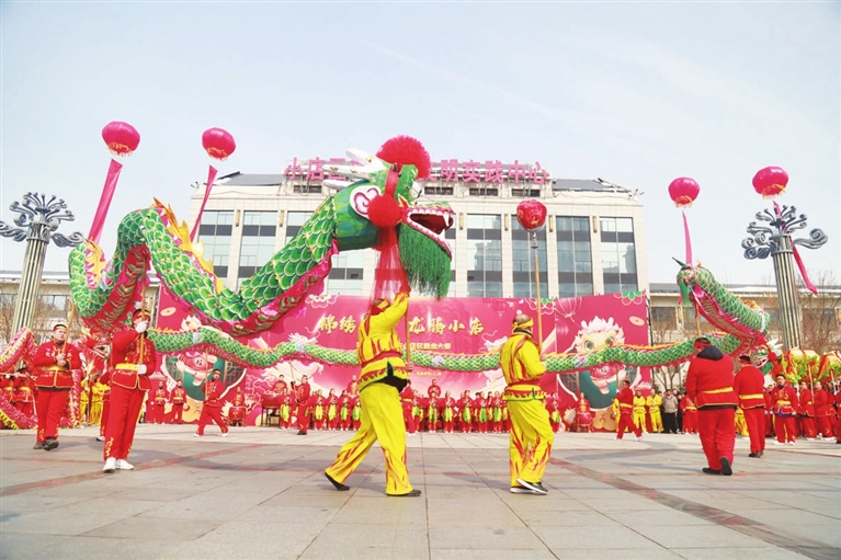 西溫莊鄉《龍騰盛世納千祥》、學府街道《彩帶龍》、北格鎮《龍騰盛世》、平陽街道《中華龍舞起來》、黃陵街道《龍行龘龘》……伴隨著鏗鏘有力的鑼鼓聲,各參賽隊伍依次登場,巨龍、空竹龍、彩帶龍輪番上陣,舞龍隊員們使出渾身解數,將龍的神韻與美感展現得淋漓盡致。在龍珠的引導下,彩龍翻騰飛躍,團龍起伏、金龍擺尾、龍盤柱等精彩動作輪番上演,群龍翻滾、游動,變換不同的造型,現場鼓聲、鑼聲、掌聲、喝彩聲如雷般響動,熱鬧非凡。